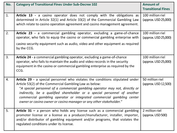 Sub-Decree 102 sets out the transitional fines applicable for violation of certain obligations under the Commercial Gambling Law: