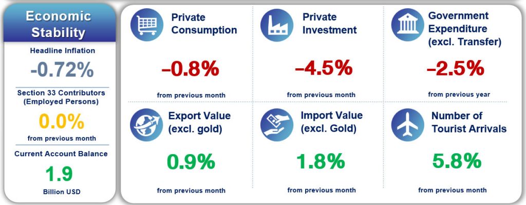 Compared to the previous month, the economy showed improvement in September. Manufacturing output rose as temporary disruption gradually subsided, which in turn supported stronger service sector activity, particularly in trade and transport. External demand expanded, reflected in higher tourist arrivals and increased receipts, especially from short-haul travelers. Merchandise exports, excluding gold, continued to grow, fueled by strong demand for electronics. However, domestic demand softened, as both private investment and consumption moderated.