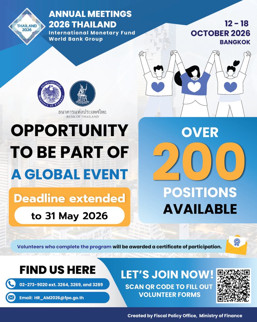 The Fiscal Policy Office (FPO), Ministry of Finance of Thailand invites undergraduate students nationwide who are set to graduate with a bachelor’s degree in 2026, currently pursuing a bachelor’s degree, or have been accepted into a bachelor’s program to take part in this historic mission and national pride by welcoming world leaders and delegates from across the globe. Applicants are encouraged to apply for selection as volunteers supporting the 2026 IMF–World Bank Group Annual Meetings, one of the world’s most prominent economic and financial gatherings, often regarded as the “Olympics of global finance.”