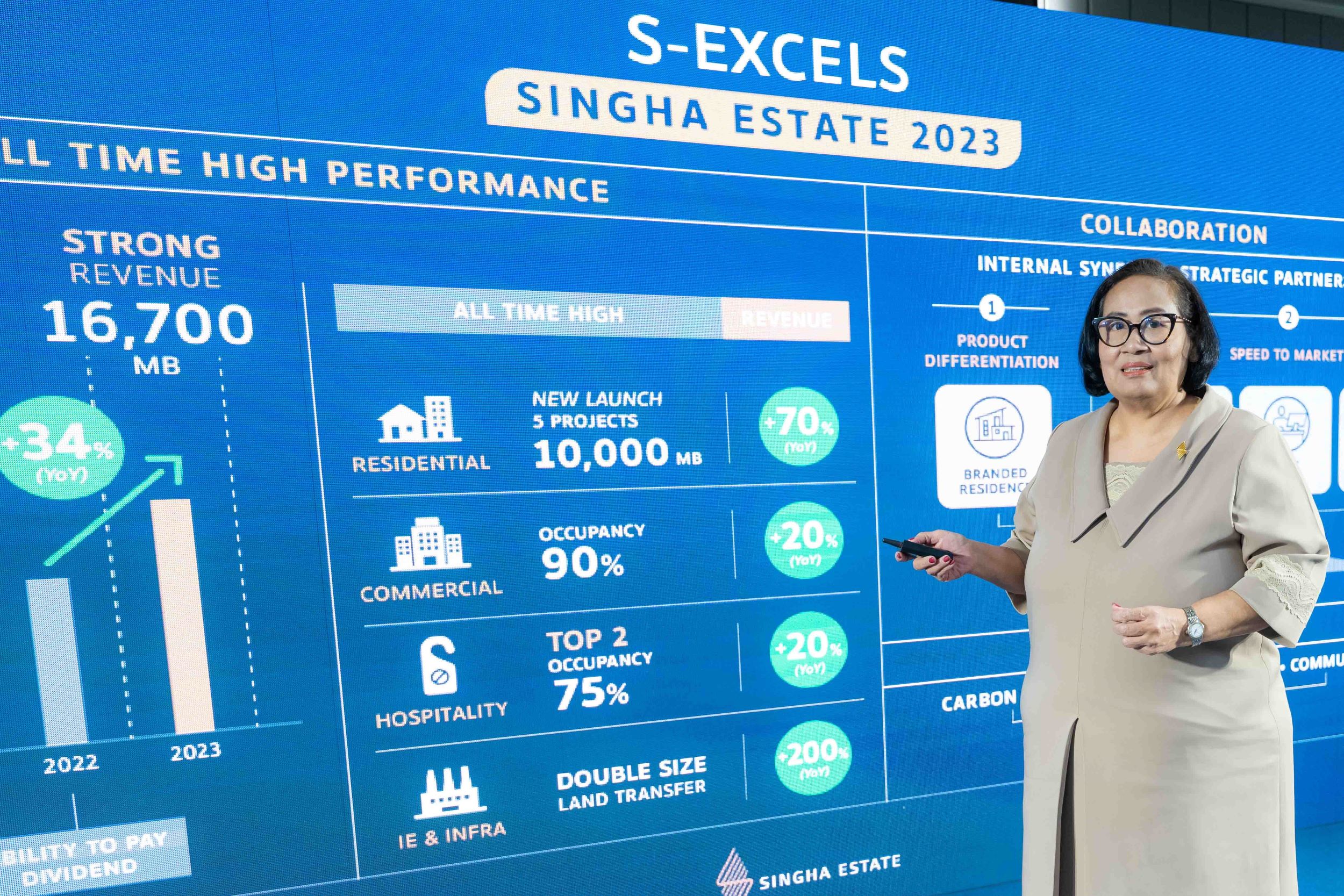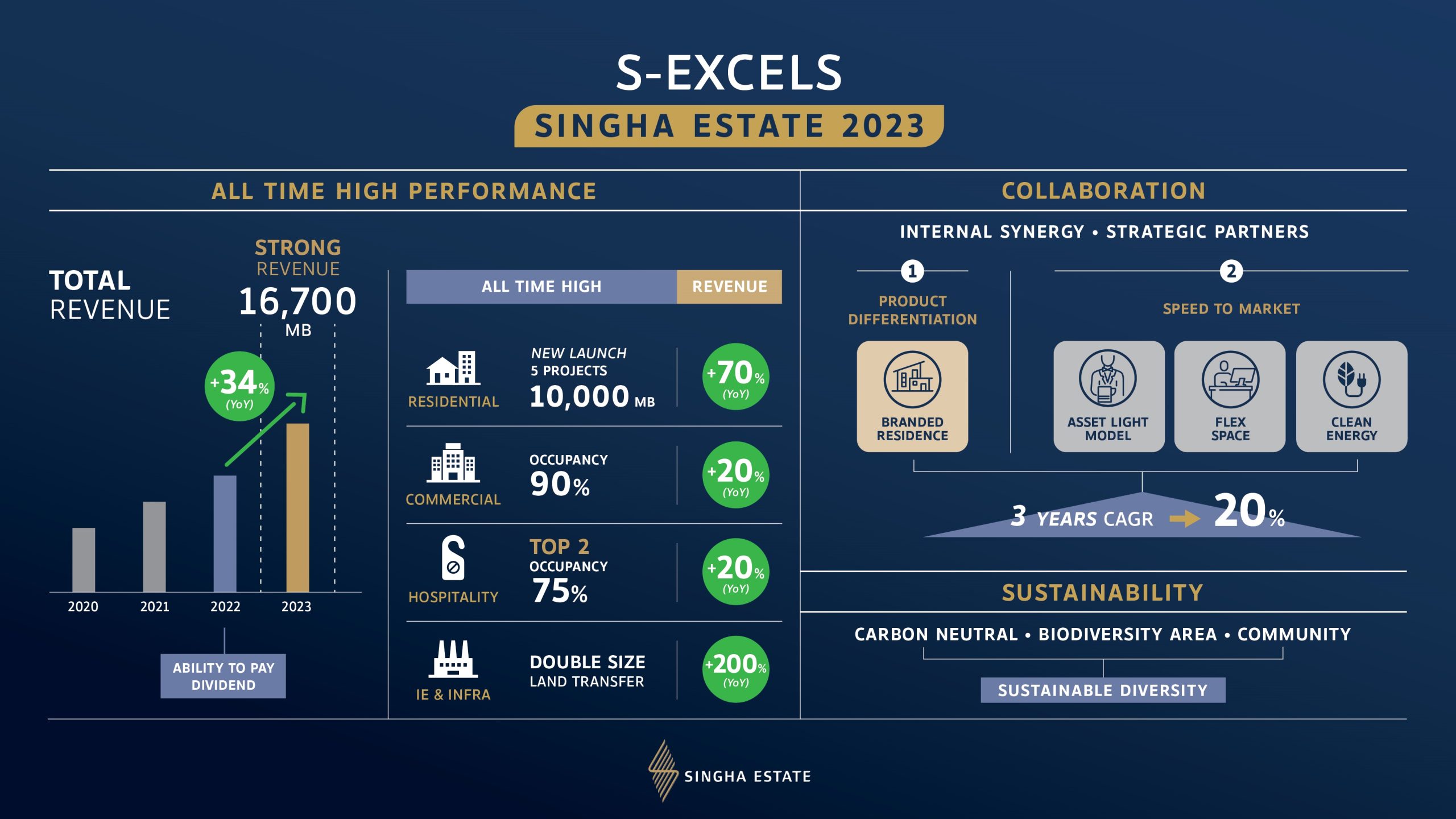 Singha Estate Public Company Limited (SET: S) will drive business growth aggressively in 2023 with the “S EXCELS” strategy, aiming for excellence in all dimensions, reaffirming the Sustainable Diversity vision to create a synergistically diversification and sustainable business growth, and increasing the total revenue by 34% from the previous year or over THB 16.7 billion. Singha Estate aims to open at least five new horizontal residence projects worth over THB 10 billion, while their commercial real estate business shows good promises with an average occupancy rate of 90%. The hospitality business under SHR management aims to increase the occupancy rate to achieve an all-time high of 75%, with expected revenue surpassing THB 10 billion in 2023. Meanwhile, the industrial estate and infrastructure business is ready to take a giant leap forward with double the number of the ownership transfers.