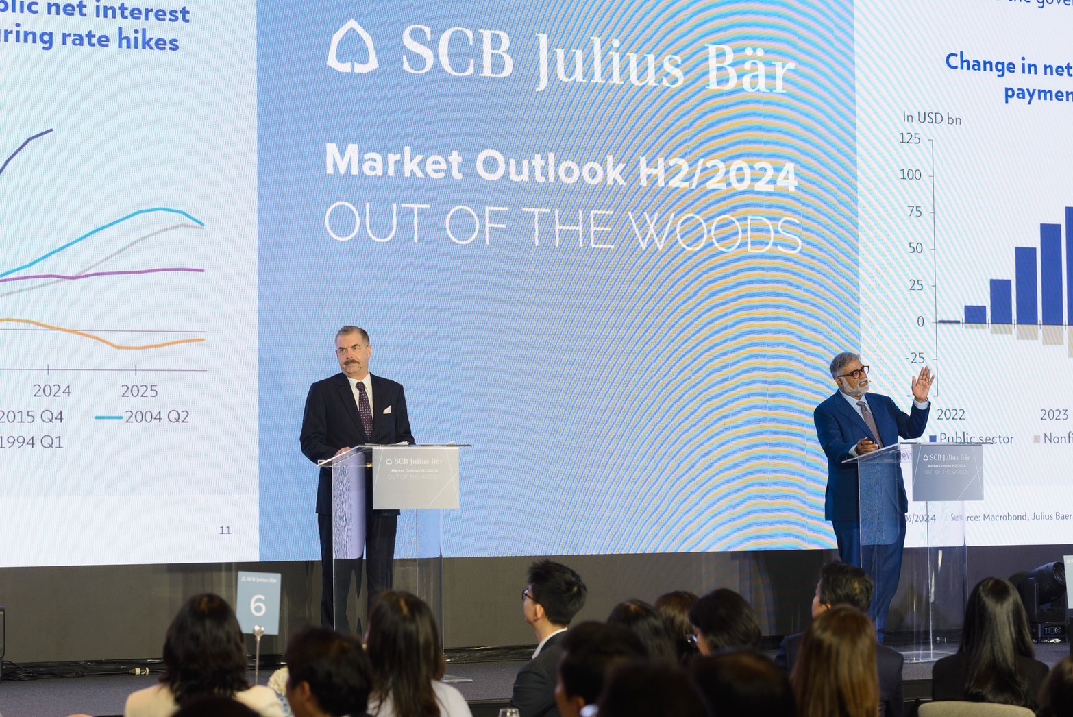 SCB Julius Baer Securities Co., Ltd. (SCB Julius Baer) recently hosted an exclusive seminar titled “Market Outlook for the Second Half 2024” for Ultra High Net Worth Individuals (UHNWIs). The seminar featured insights prepared by Julius Baer, predicting a favorable shift in the global economy, often described as being “Out of the Woods.” This period is seen as an opportune time to diversify investments across various assets. The U.S. economy is expected to continue its robust growth, with a potential interest rate cut anticipated in September. Additionally, global trade is likely to benefit from the resurgence of China’s industrial sector. In terms of investment strategy, maintaining cash reserves remains prudent, allowing flexibility to allocate funds into other asset classes in the latter half of the year. The focus continues on investing in high-quality bonds and U.S.-denominated debt instruments in emerging markets. A greater emphasis is recommended on investing in cyclical stocks. For themes related to the next generation, there is a continued positive outlook on sectors like Automation, Robotics, and Future Cities.