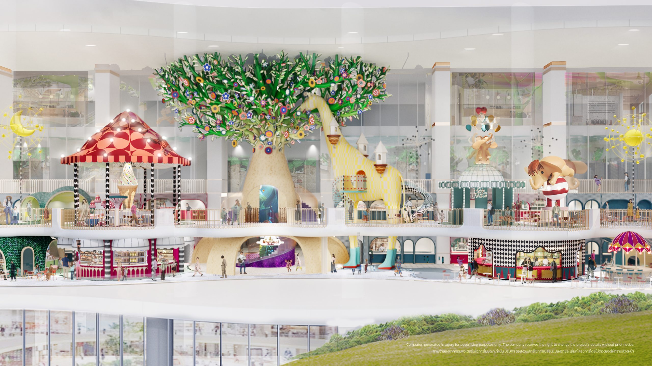 - Whimsical Market: A fantasy landmark of happiness, highlighted by a three-story-tall tree, illuminated with light, color, and sound, and adorned with moving sculptures that feel alive, evoking the wonder of a theme park.