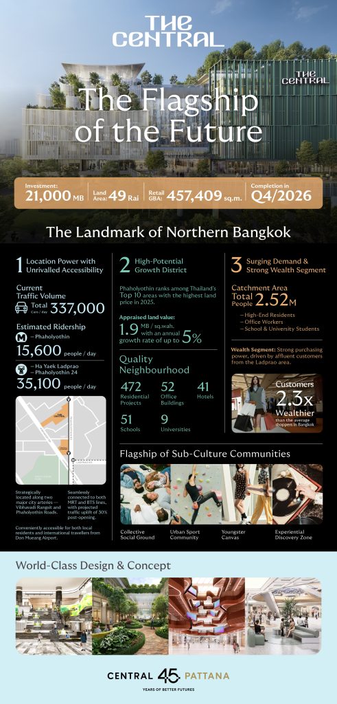 - Phaholyothin Rising with Potential on Par with Ratchaprasong: strategic location ideal for world-class development based on: 1) Transit-Oriented Development – anchored by major BTS, MRT and arterial roads, seamlessly connecting life, work and mobility; 2) High-Density & Mixed Demand – surrounded by mid- to high-end residences, offices, hotels and educational institutions; and 3) Anchor of Flagship Brands; – as centralwOrld stands as the “Flagship Landmark” of Ratchaprasong, The Central Phaholyothin will become “The Landmark of Northern Bangkok,” driving the district’s future growth.