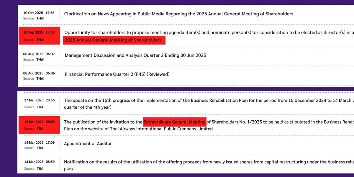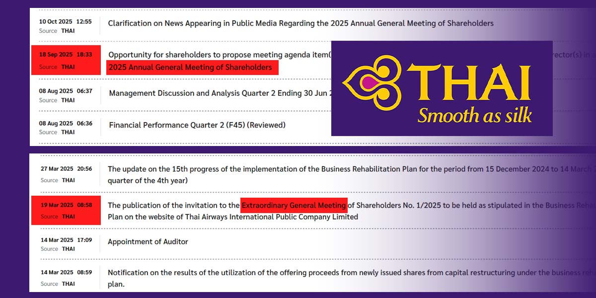 However, official filings from Thai Airways clarify that the meeting in question was not an additional AGM but instead an Extraordinary General Meeting of Shareholders No. 1/2025, held in strict adherence to the company’s Business Rehabilitation Plan. According to a disclosure published on the Stock Exchange of Thailand’s website on 19 March 2025, the meeting was scheduled for 18 April 2025 as required by the rehabilitation process. The company subsequently reported the meeting’s resolutions via a follow-up disclosure on the same day.