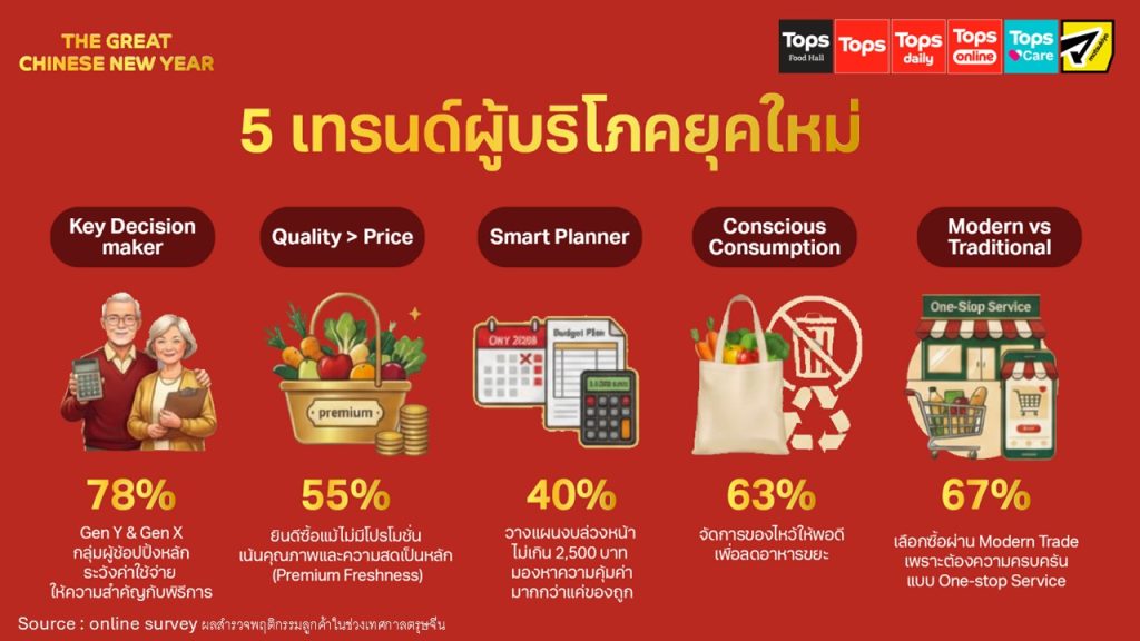 TOPS, the food business under Central Retail (SET: CRC), has released the results of its consumer behavior survey for Chinese New Year 2026, revealing five key trends. The findings show that Thai consumers are increasingly inclined towards ‘Smart Purchasing’, placing greater importance on ‘quality’ over ‘promotions’, while believing that ‘saving must come with auspicious meaning’.