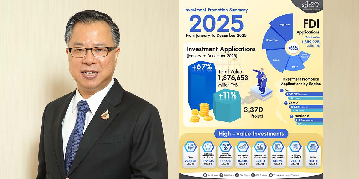 The Thailand Board of Investment (BOI) today announced investment promotion results for 2025, signaling a strong surge in investor confidence and a strategic shift toward high-value sectors. Total investment applications received soared to approximately 60.23 billion USD (1,876,653 million baht) across 3,370 projects, marking a substantial 67% increase in value and an 11% increase in number of projects compared to 2024.