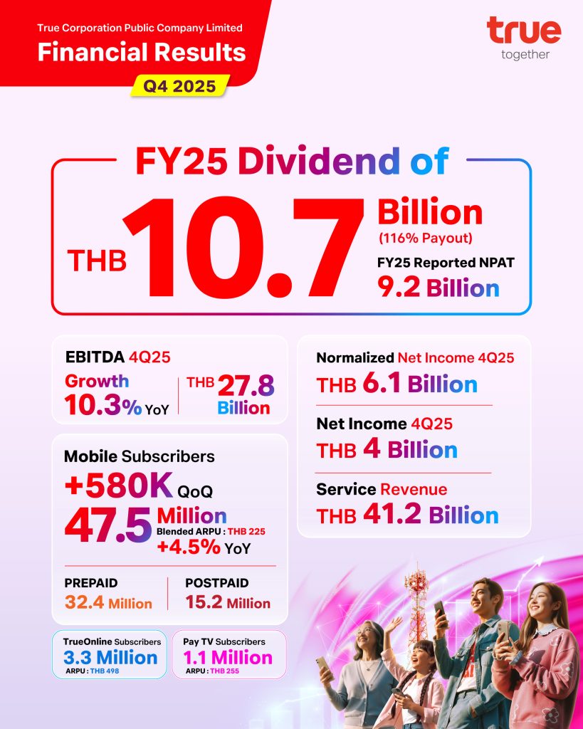 True Corporation Public Company Limited (SET: TRUE) announced financial results for the fourth quarter of 2025, delivering its fourth consecutive quarter of profitability. The Company reported a net profit after tax of THB 4.0 billion, with normalized profit of THB 6.1 billion after adjusting for one-off items. EBITDA for the quarter was THB 27.8 billion, reflecting the full-quarter benefit arising from spectrum acquisition. The Board of Directors has recommended a final dividend of THB 4.1 billion, bringing full-year dividend to THB 10.7 billion, reflecting a payout ratio of 116% of reported NPAT and 56% of normalized NPAT.