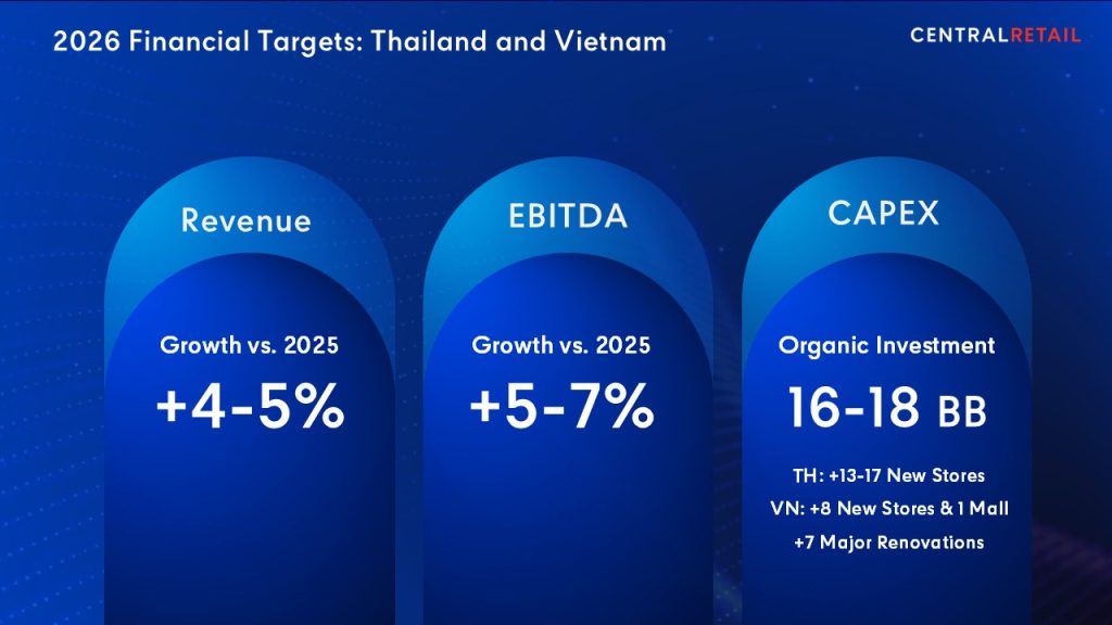 The company will also carefully explore expansion opportunities into other ASEAN markets. Central Retail targets revenue growth of 4–5% and EBITDA growth of 5–7% year-over-year for 2026. The company prioritises disciplined financial management to ensure high-quality sales and profitability, maintaining strong financial position to support potential mergers and acquisitions (M&A) in the future, as well as delivering sustainable returns to its shareholders.