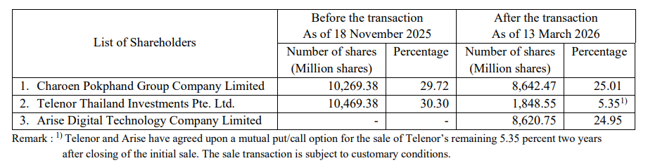 The Company has been additionally informed by Telenor and Arise that the share purchase transaction between them was successfully completed on 13 March 2026. Arise acquired shares of the Company from Telenor, representing 24.95% of the Company’s paid-up capital. In this regard, Arise does not fall within the scope requiring a tender offer pursuant to the rules, conditions, and procedures in accordance with Notification of the Capital Market Supervisory Board Re: Rules, Conditions, and Procedures for the Acquisition of Securities for Business Takeovers. Consequently, Arise has become a major shareholder of the Company, replacing Telenor.