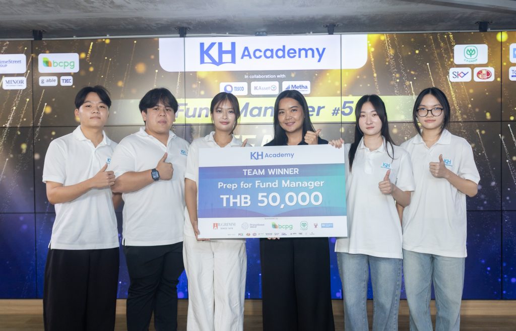 The winning team, Team F, mentored by Ms. Rinrada Narakornpijit, Assistant Fund Manager, Kasikorn Asset Management Co., Ltd. (KAsset), comprised Mr. Patipan Opaspongpipat (Faculty of Commerce and Accountancy, 4th Year, Chulalongkorn University), Ms. Kanyanat Koohathongsamrit (Faculty of Commerce and Accountancy, 2nd Year, Thammasat University), Ms. Hataichanok Ganjananonth (Faculty of Business Administration for Society, 3rd Year, Srinakharinwirot University), Mr. Thansit Thanaphatkesaemchai (Faculty of Business Administration for Society, 2nd Year, Srinakharinwirot University), and Ms. Pasinee Boonsiri (Faculty of Business Administration for Society, 2nd Year, Srinakharinwirot University). Ms. Wanwisa Punosoth, Co-Founder and Director of Partner Relations at KH Academy, presented the awards.