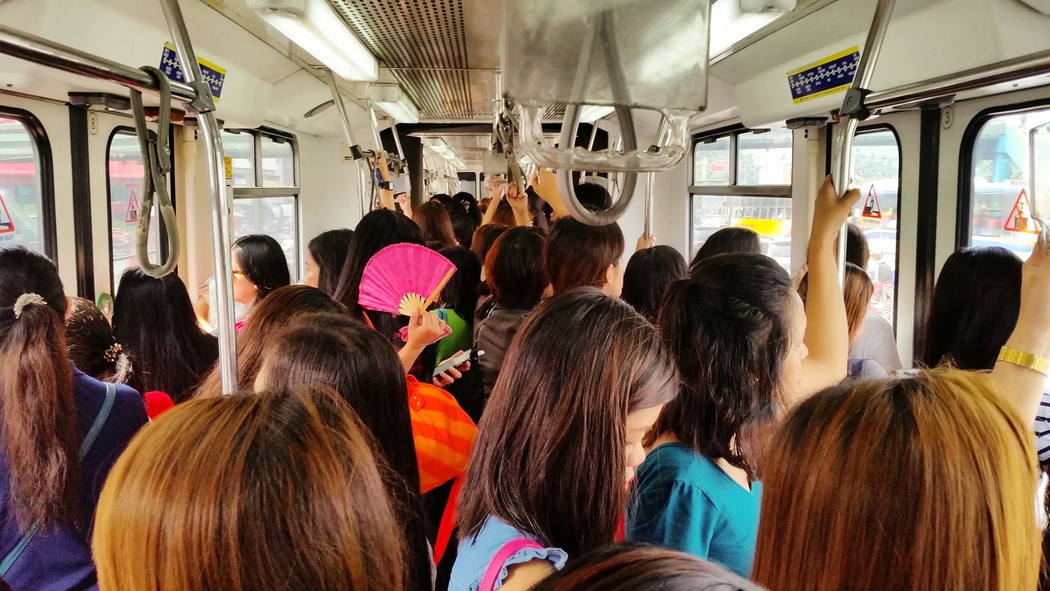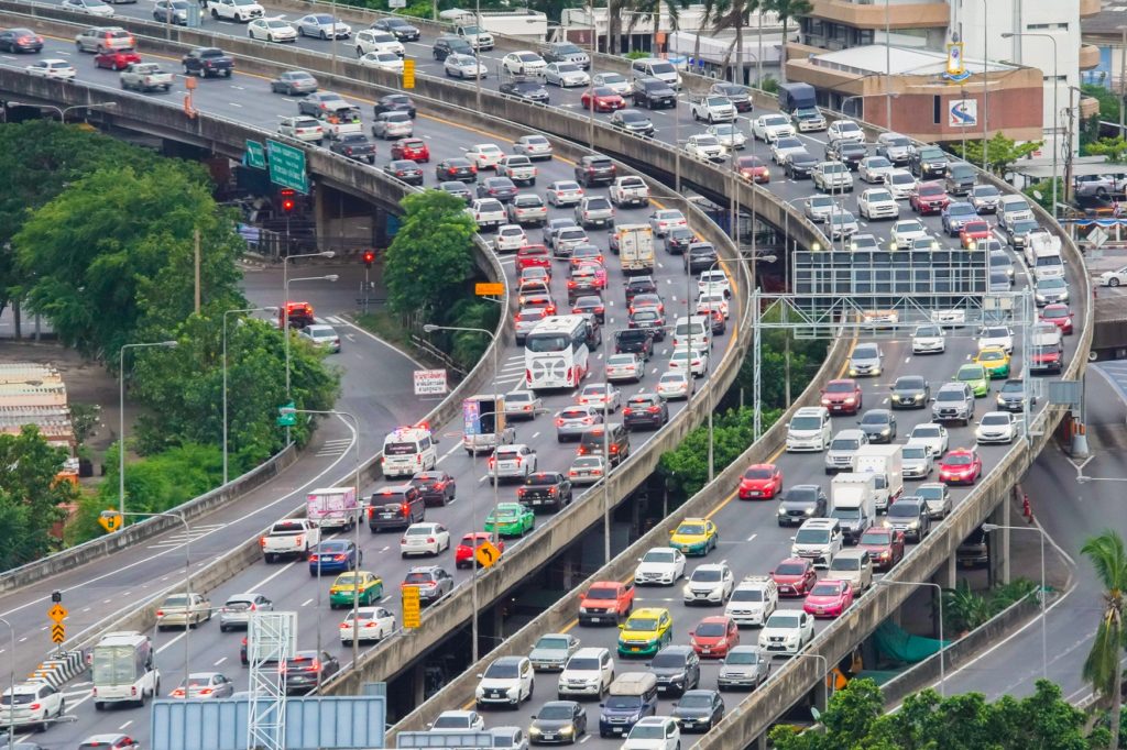 Aerial view of busy cars with traffic jam in the rush hour on highway road street on bridge in Bangkok Downtown, urban city in Asia, Thailand at sunset. Intersection junction. Toll gate in Rama 9
