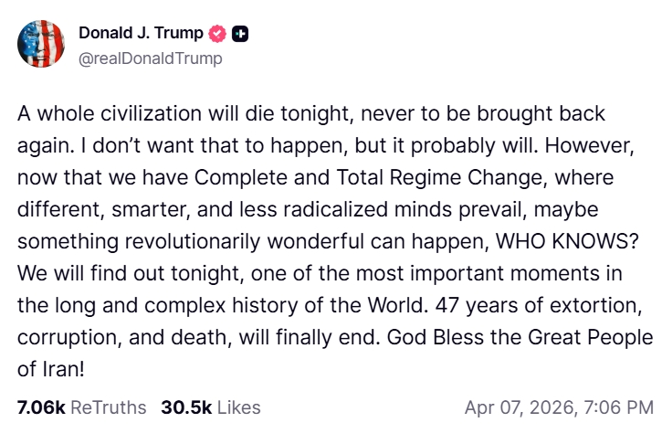 In a post on Truth Social, President Trump stated that unless Iranian authorities accept terms related to the Strait of Hormuz, an irreversible disaster could unfold, signaling the potential for heavy loss and escalation.