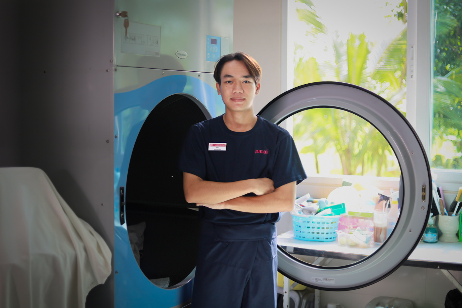 Nu – Panupong Paengyod, a young man hailing from Sakon Nakhon, specializing in housekeeping, enthusiastically shared his perspective: “I decided to pursue housekeeping because I have a natural inclination for taking care of rooms and crafting a welcoming atmosphere for guests. Witnessing well-organized guest rooms fills me with joy. On a personal note, I have a passion for arranging flowers, using the blooms found in the vicinity to enhance the décor. It brings a sense of freshness and beauty to everything. When guests staying here appreciate the carefully arranged flowers, it brings even greater satisfaction.”