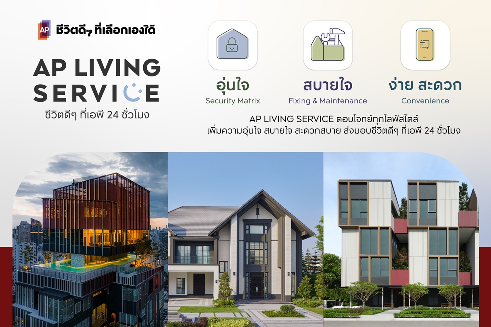 Mr. Vittakarn Chandavimol, Chief Corporate Strategy and Creation, AP Thailand Public Co. Ltd., said, “AP Thailand has a great mission to be more than a property developer, but to give our customers Cheevit Dee Dee Tee Lueak Eng Dai. Our focus is on delivering quality residential properties in the form of condominiums, single detached homes, townhomes and duplex homes in tandem with AP Living Service, which is a range of services and solutions aimed at ensuring our residents have a ‘Cheevit Dee Dee’ in all aspects 24 hours a day at any of AP properties all around the country. We do that through three main elements that serve to meet all the exact needs of AP customers after they have moved into their properties.”