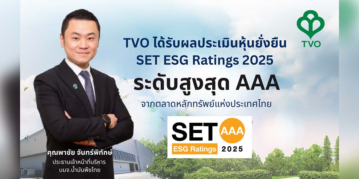 Thai Vegetable Oil Public Company Limited (SET: TVO) has been awarded the AAA ratings, the highest recognition in the SET ESG Ratings 2025 conducted by the Stock Exchange of Thailand (SET). Among 365 listed companies assessed this year, TVO’s achievement highlights its strong performance and comprehensive approach to environmental, social, and governance (ESG) management in alignment with international standards.