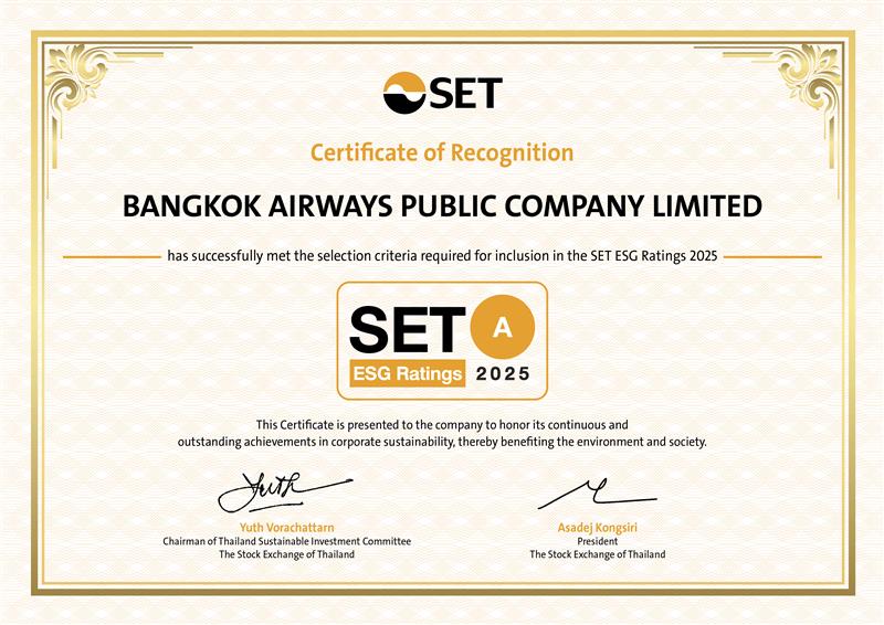The SET ESG Ratings are recognized as one of Thailand’s key sustainability benchmarks, assessing listed companies based on disclosures, policies, and performance across environmental, social, and governance areas. In 2025, a total of 265 companies met the assessment criteria, with 67 companies achieving an “A” rating. Bangkok Airways’ inclusion in this group reinforces its credibility in ESG practices and reflects its continued alignment with internationally recognized sustainability standards.